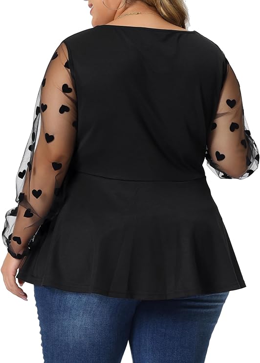 Peplum V Neck Top with Sheer Mesh Heart Sleeves up to size 4X