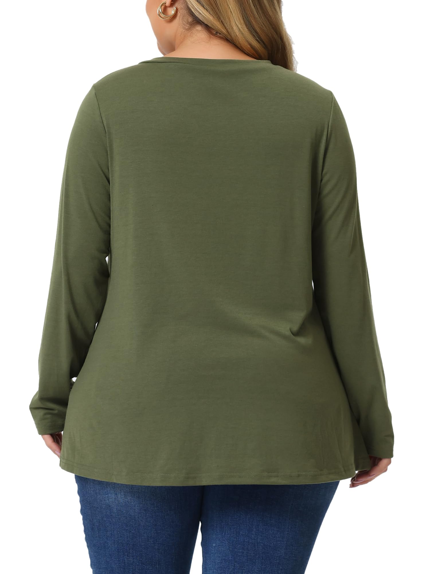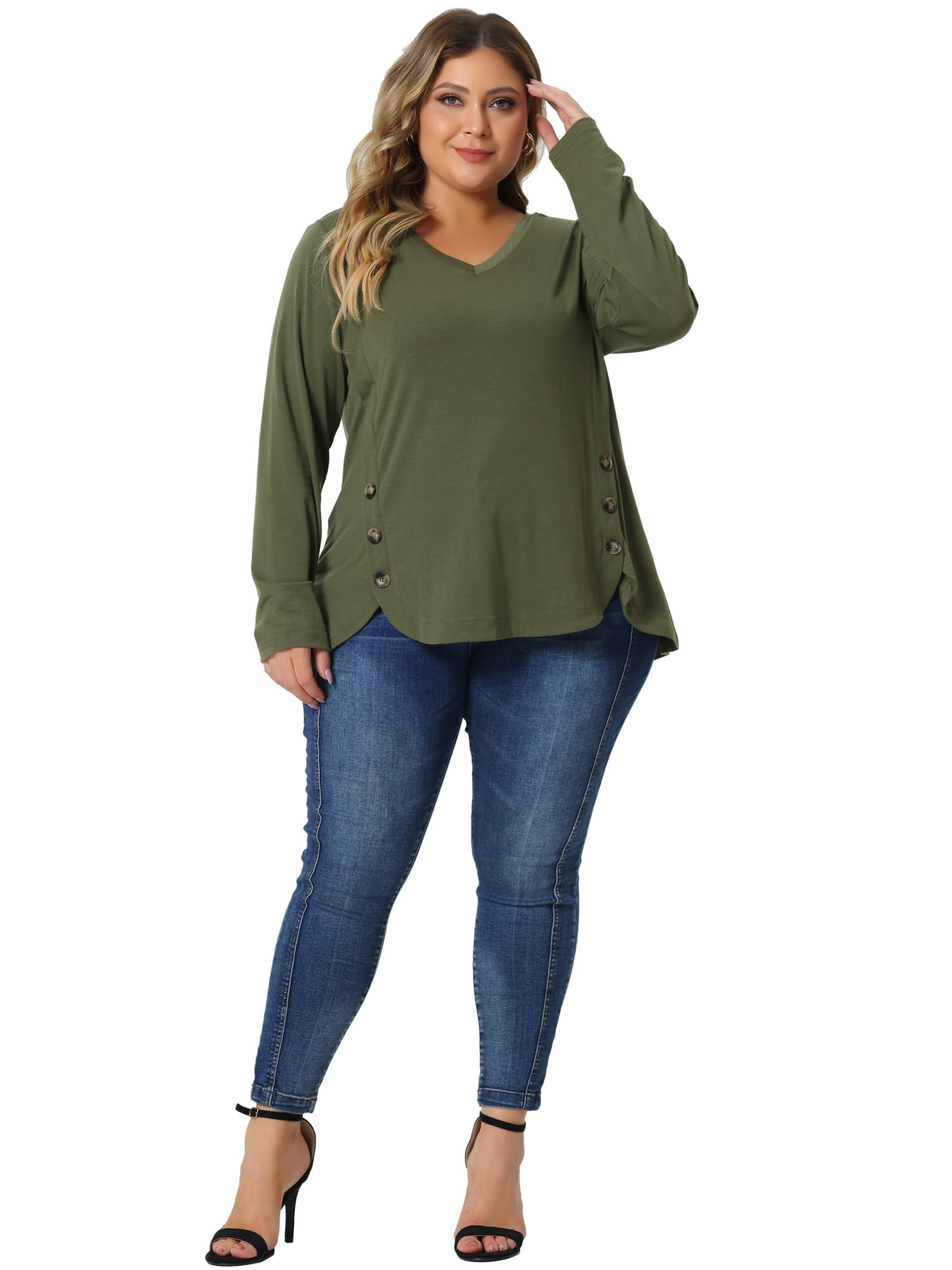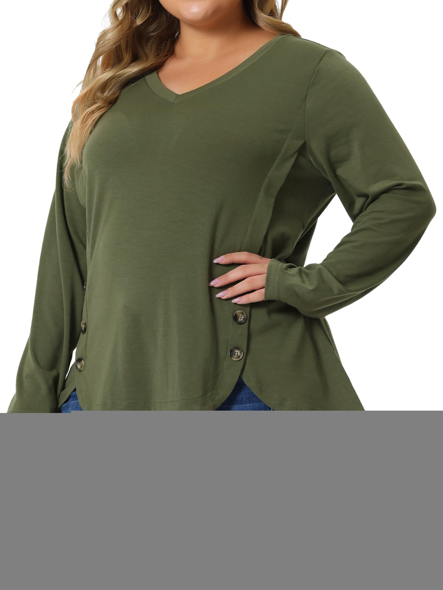 V neckline, long sleeves, classic solid color, buttons on both sides, plus a gracefully curved hemline, casual loose fitting layering long t-shirts