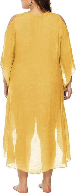 Beachwear that celebrates your curves and style! Our hi-low hem swimsuit cover-up is a must-have for your summer wardrobe, designed to be loose, airy, and flowy. This piece features a cold shoulder design, deep V-neck, and semi-sheer fabric with 3/4 sleeves.