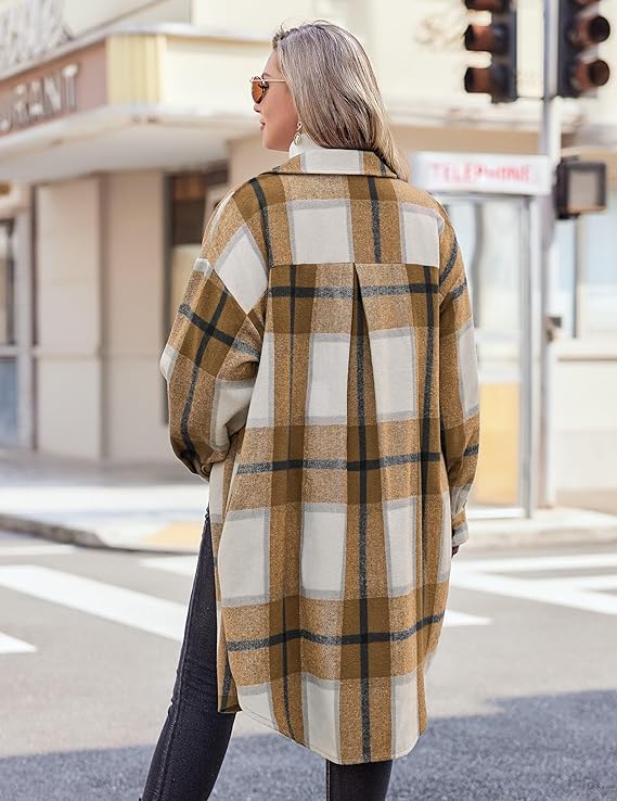 This versatile piece features two side pockets, two flap chest pockets, and a classic collared shirt design. The fall plaid duster, also known as a shacket, combines the elements of a long-sleeve shirt with a lightweight plaid jacket. Whether you're heading to work, running errands, or meeting friends, this piece effortlessly blends comfort, style and is a must-have for country boho fashion.