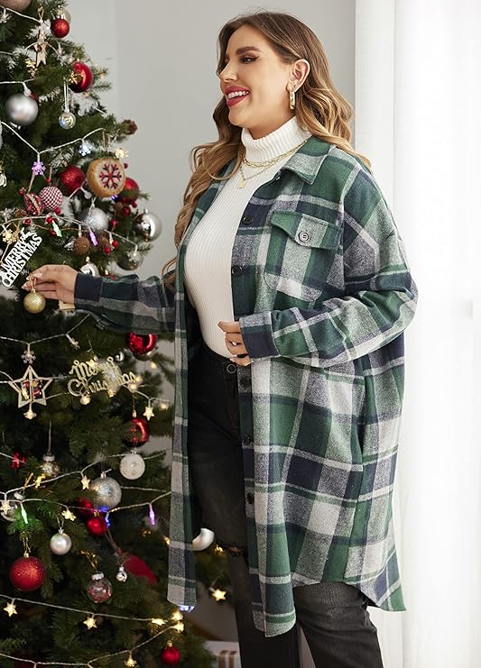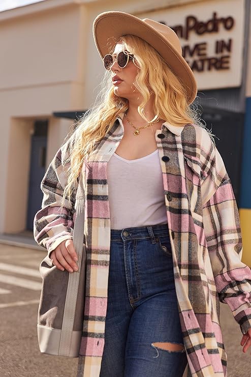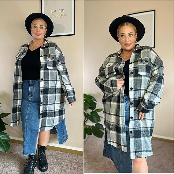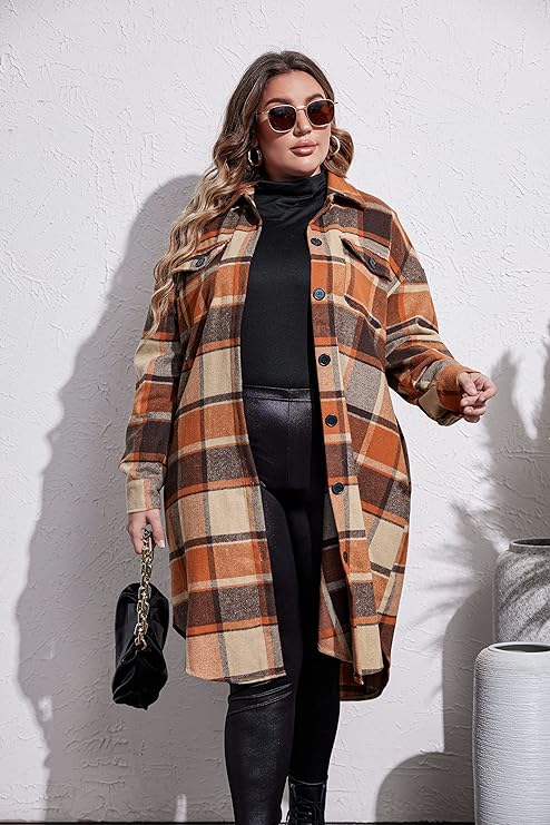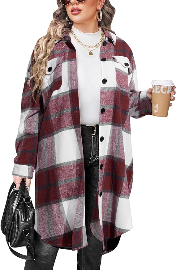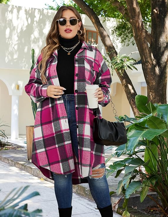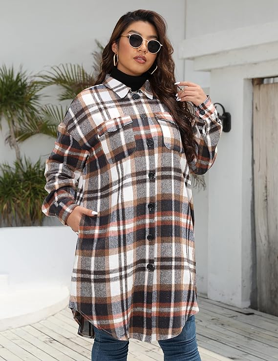 Introducing our plus-size button-up fashion oversized lightweight plaid duster, available in an extensive palette of 21 colors and available in sizes up to Plus Size 28. (Be sure to check the size chart!)