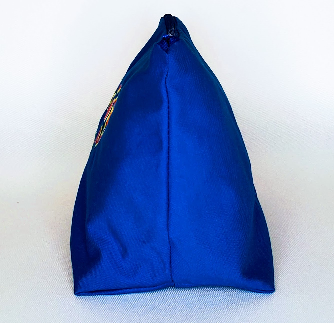 Our ample triangular bag, 7" wide x 6" tall with a 3 ½" wide base, offers abundant storage space. Its unique shape stands tall and sturdy for easy access to contents through the 6" top opening. Practical and stylish!