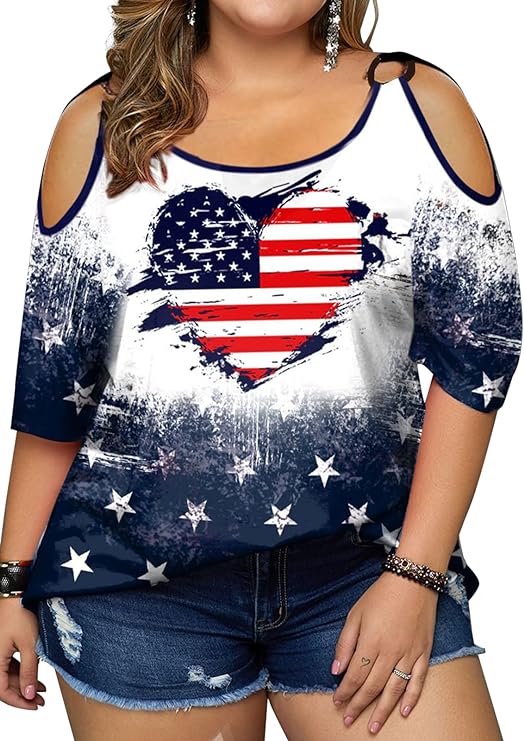Plus Size - Cold Shoulder - American Flag Shirt Fourth of July Tee - Up to Size 5X!