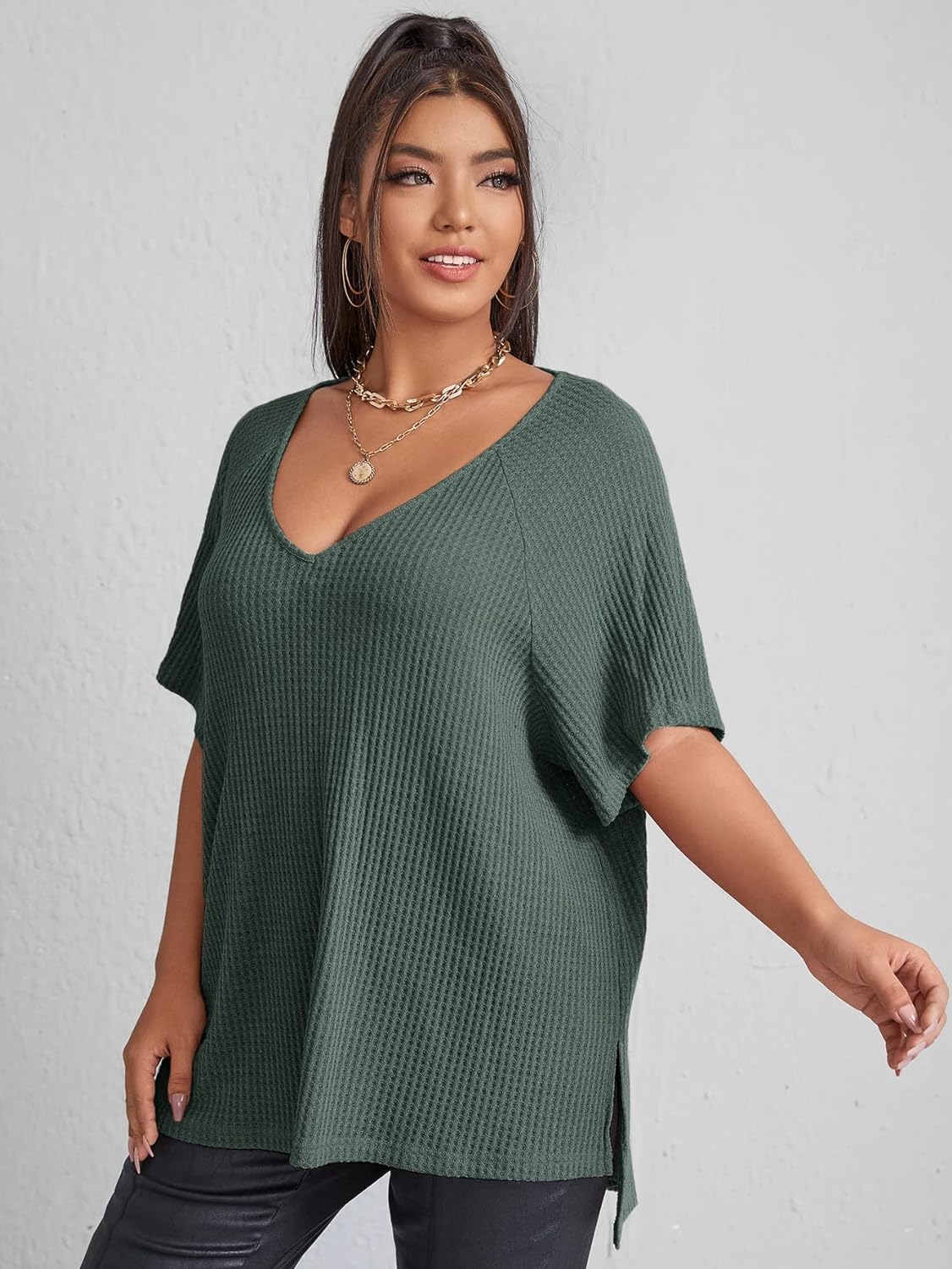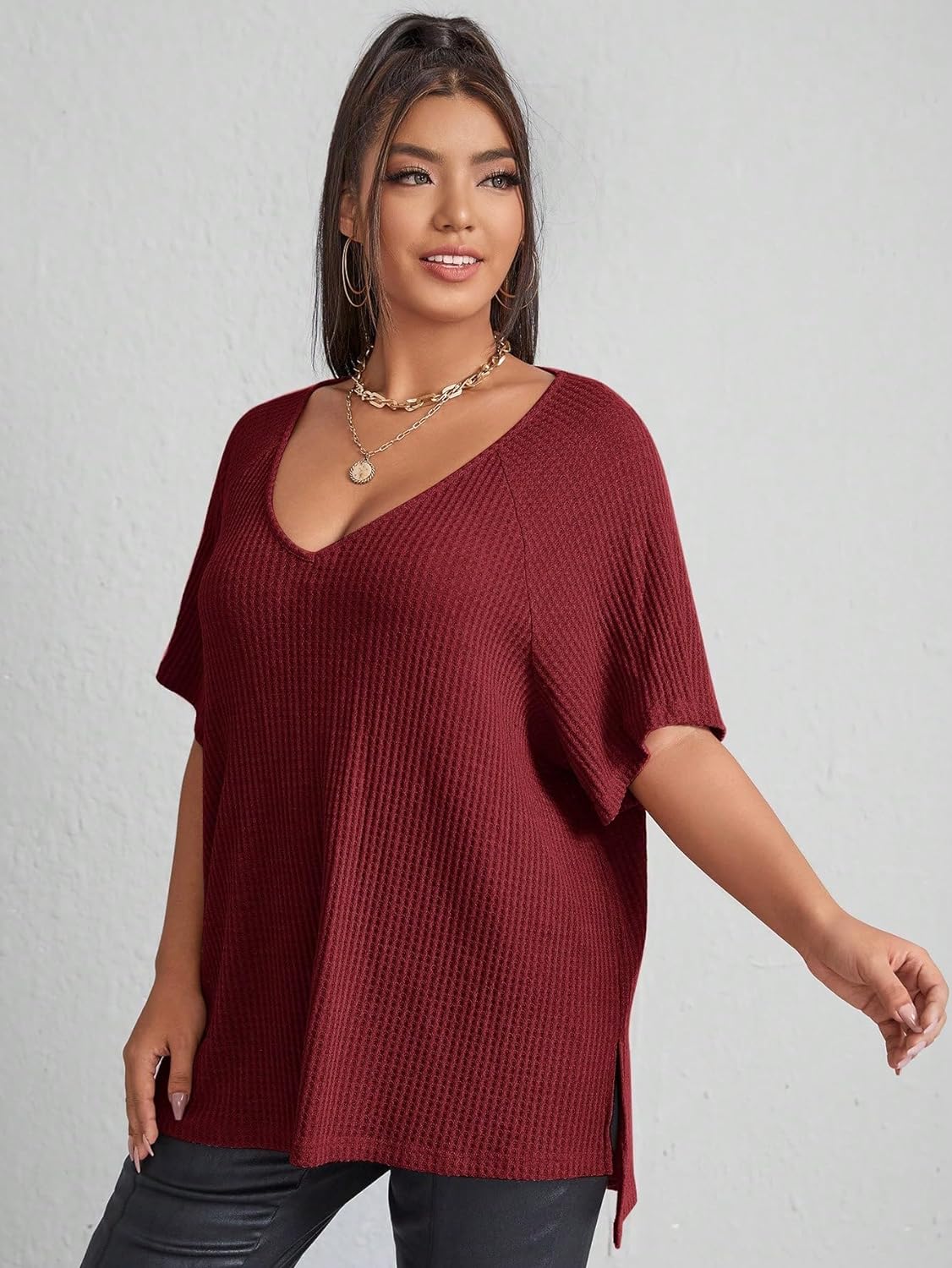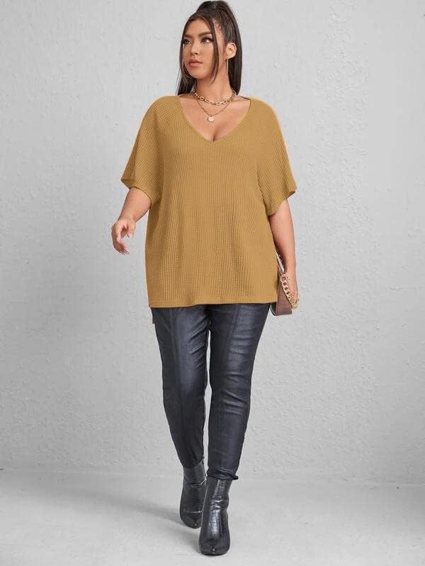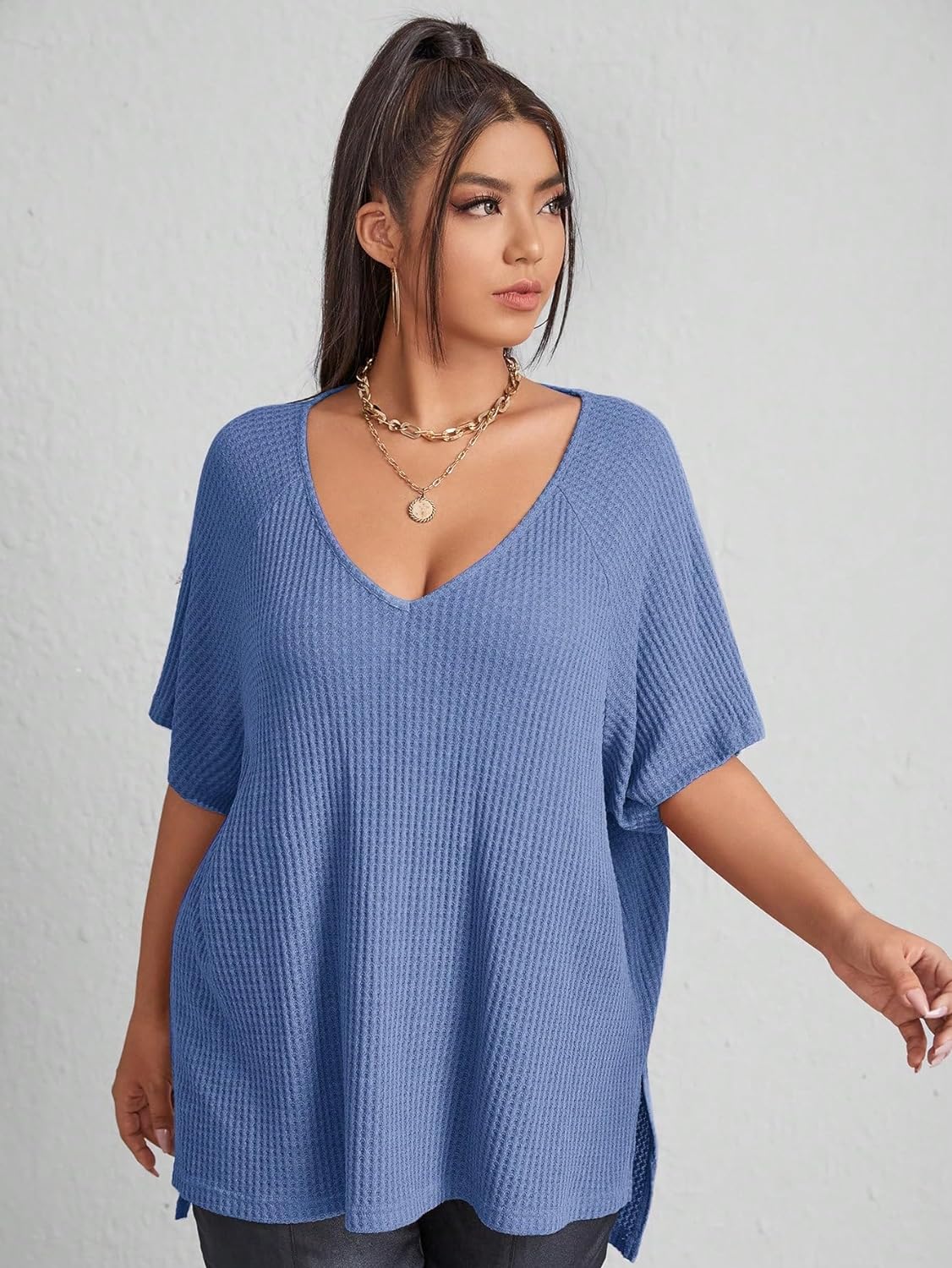 Featuring a flattering V-neckline and half sleeves, this top exudes casual elegance. The loose and relaxed fit, along with the split hem design, adds a touch of laid-back charm, perfect for any occasion.