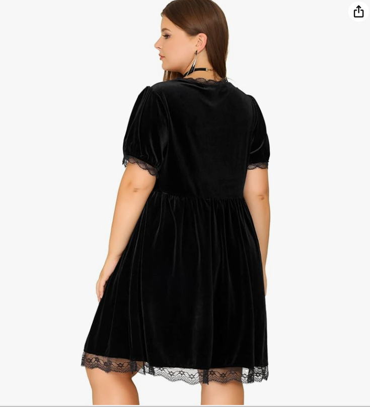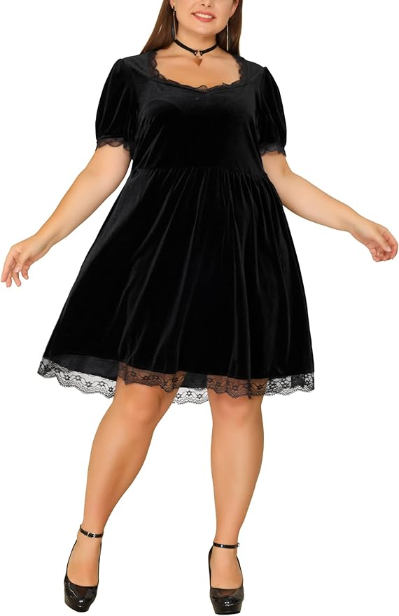 Plus Size Velveteen, Lace Trim, A Line, Short Sleeve Dress up to Size 4X