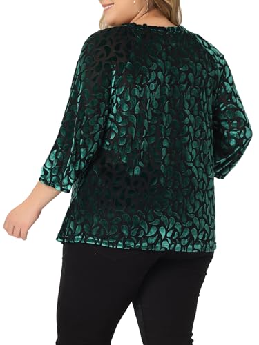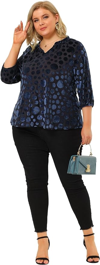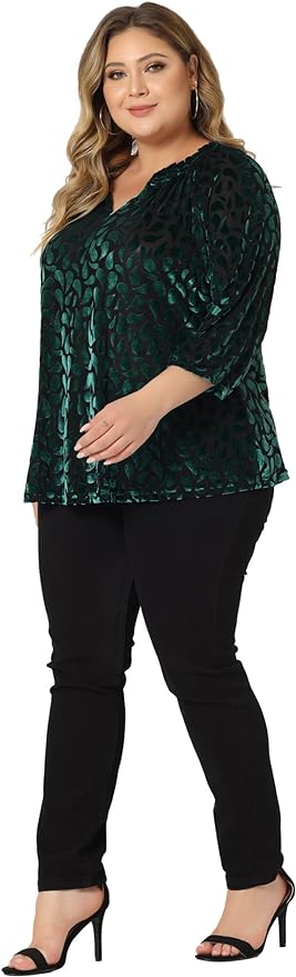 Discover holiday elegance from our Curated Collection! This plus-size burnout velvet top is perfect for the season, with dolman-style 3/4 sleeves and a modest V-neck.