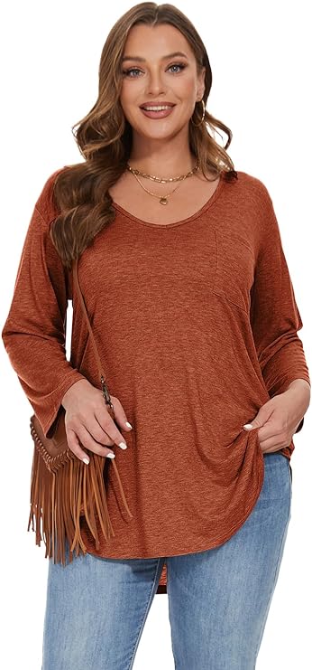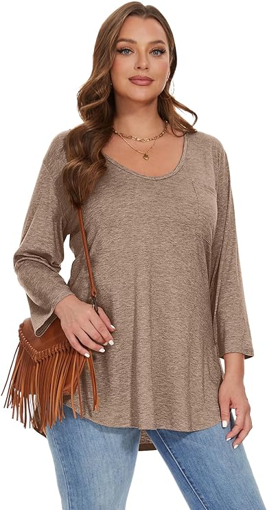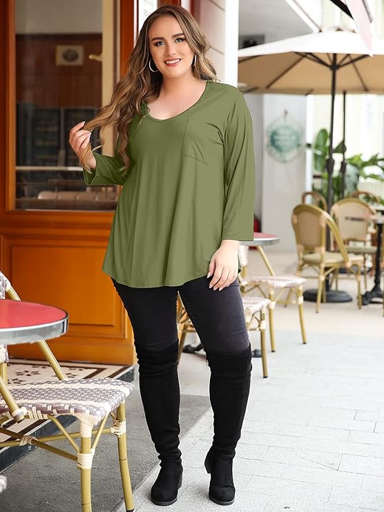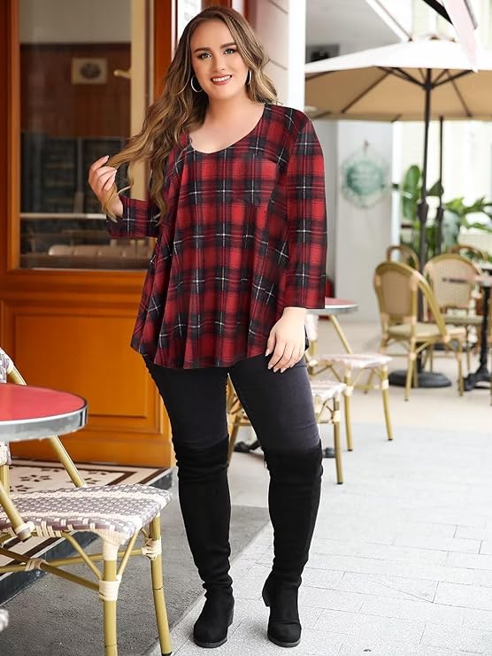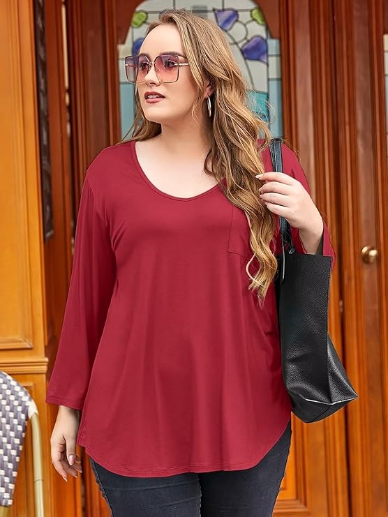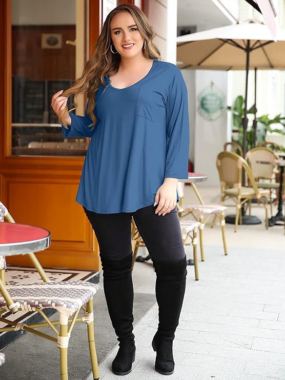 The loose fit and LOW scoop (slight V) neckline design make these plus-size tunics perfect for Fall, Spring, and Winter. With a loose waist and flattering shirttail hem, they provide a comfortable and stylish look.