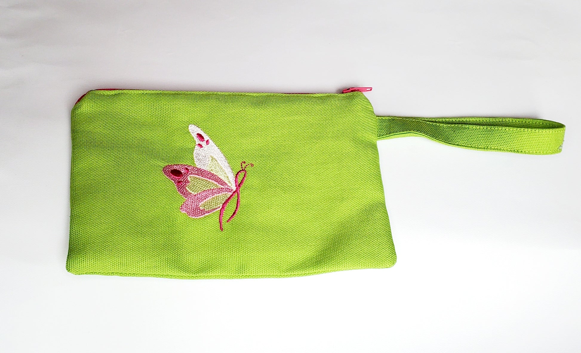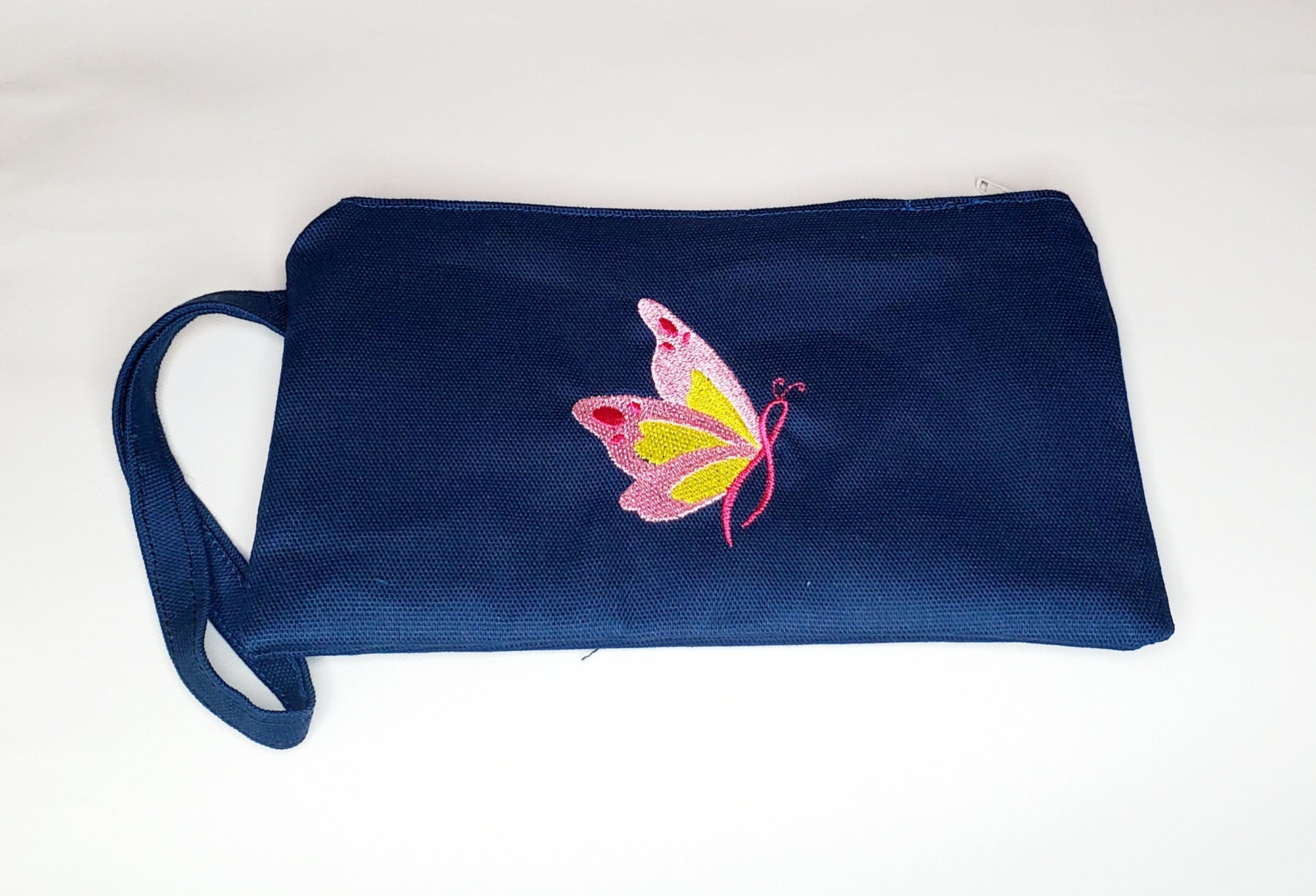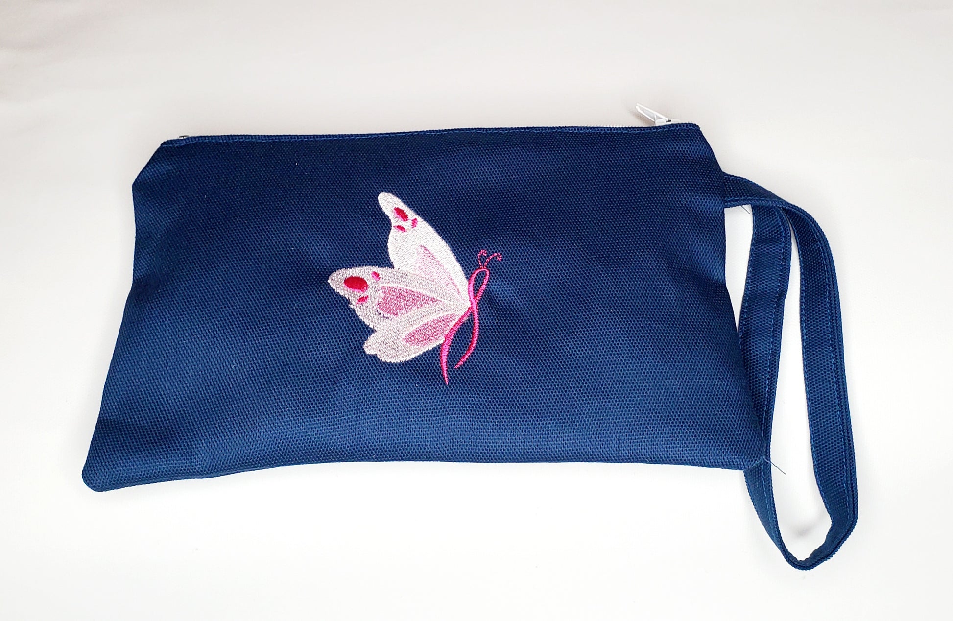 Breast Cancer Butterfly Embroidered Accessory Bag with Strap