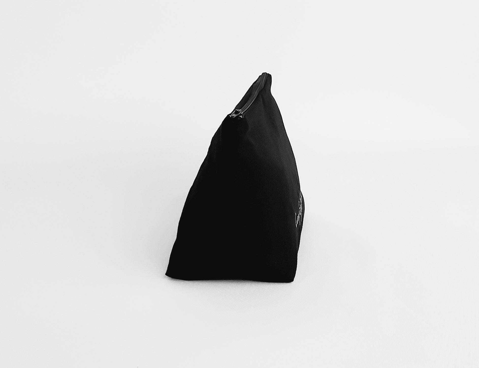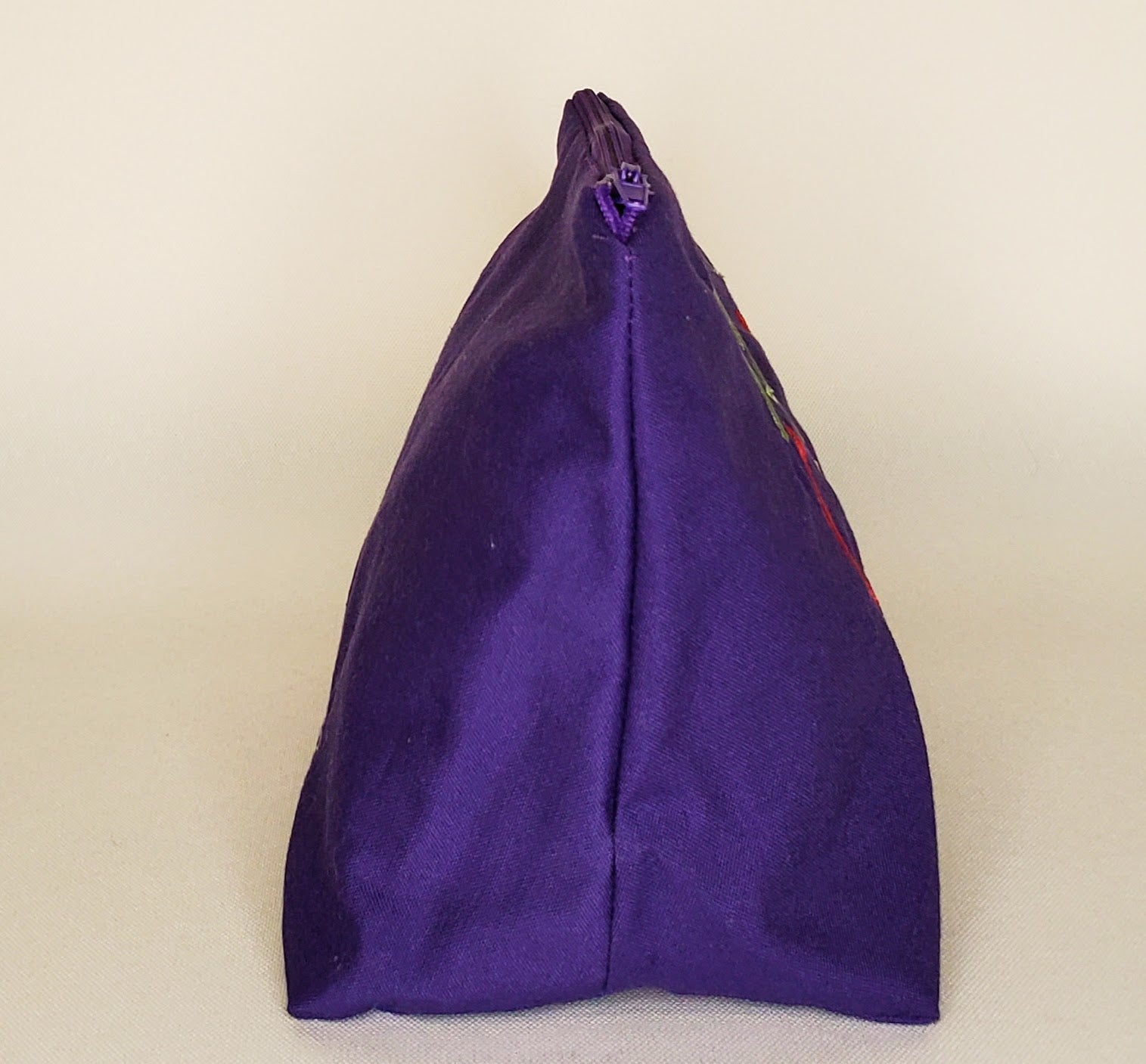 Our ample triangular bag, 7" wide x 6" tall with a 3 ½" wide base, offers abundant storage space. Its unique shape stands tall and sturdy for easy access to contents through the 6" top opening. Practical and stylish!