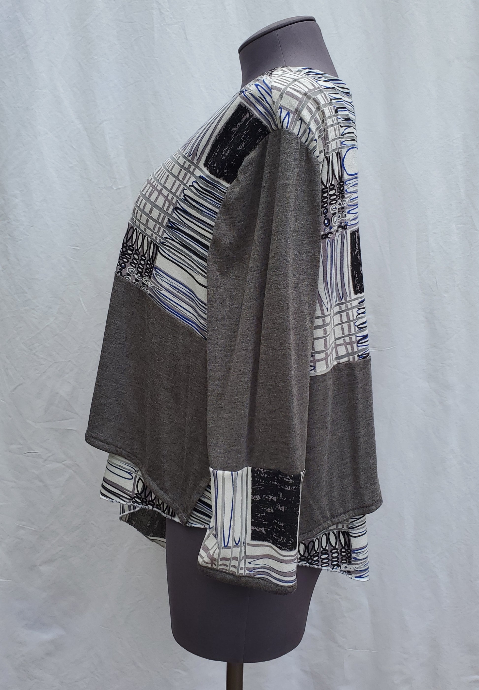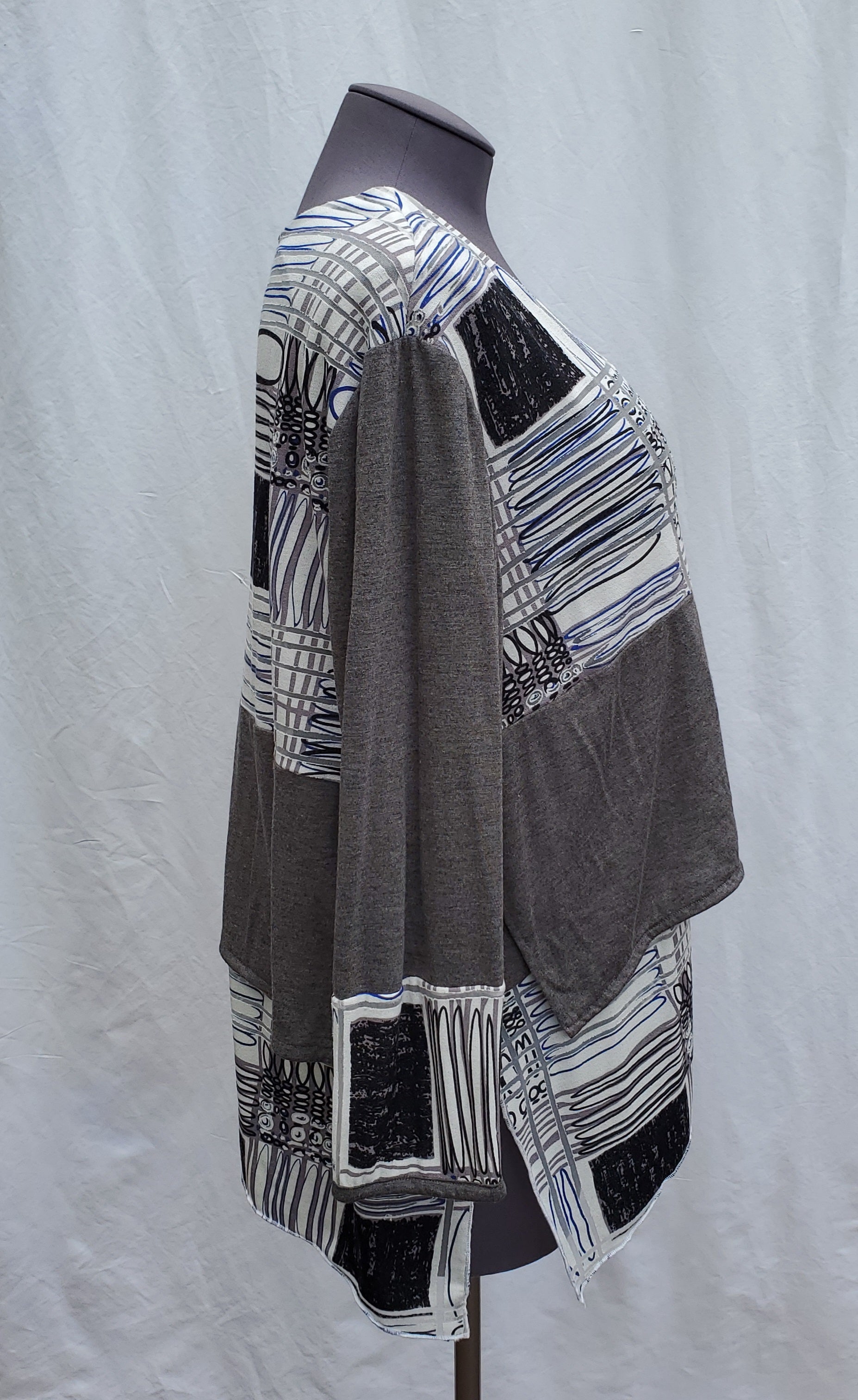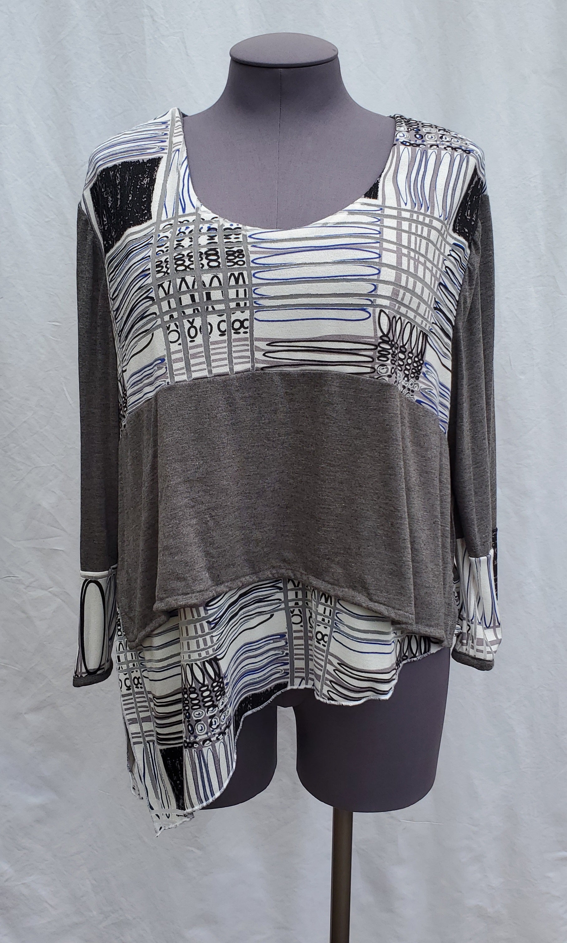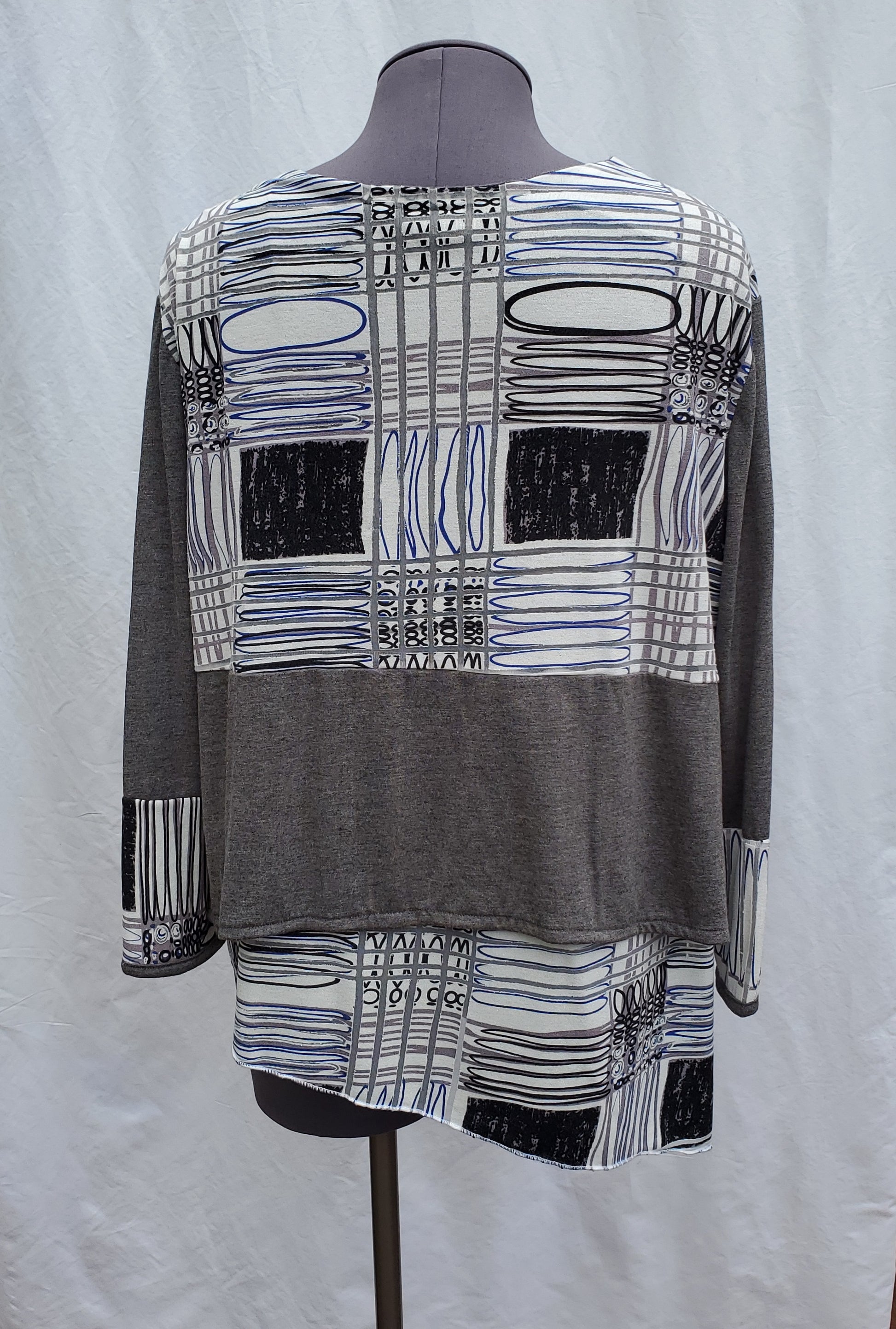 Introducing our grey geometric shirt, expertly crafted for multiple body shapes! The asymmetrical design and double-layered fabric flatter larger curvy middles, while side slits accommodate curvier hips. The 3/4 sleeves showcase the geometric design on both front and back, ensuring you look fabulous from all angles.