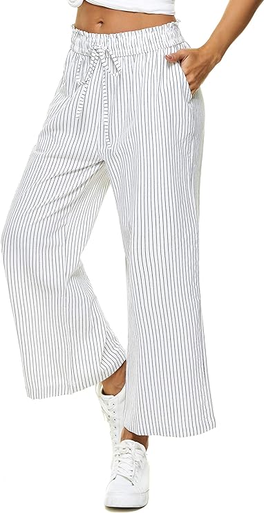 These pants feature a casual yet stylish design. With a high-waisted, wide-leg silhouette and elastic waistband with drawstring tie knot front, they offer both style and ease of wear. Two side pockets add functionality, while the loose-fitting design provides a relaxed, comfortable feel.Â
