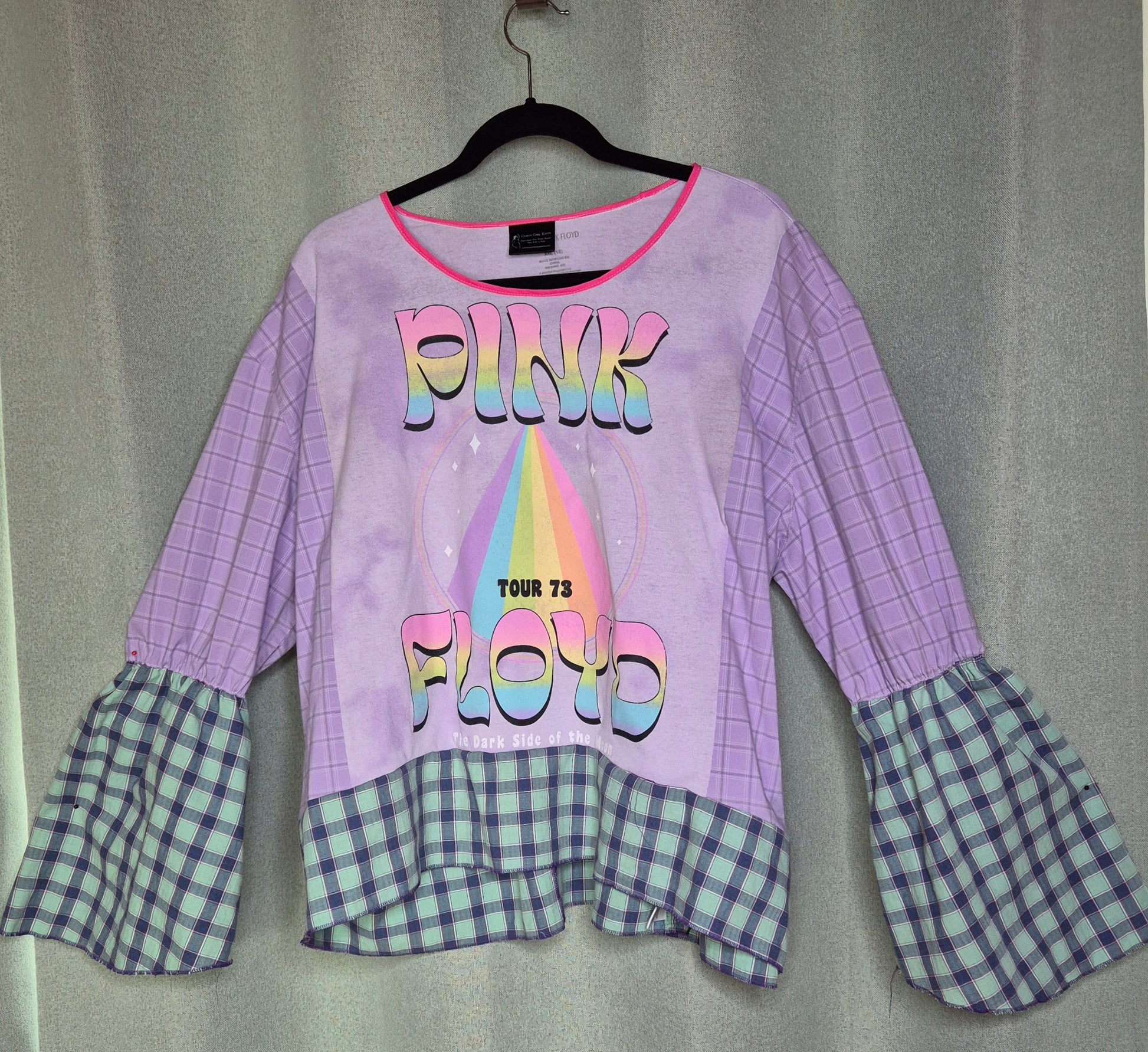 Rock your style with this one-of-a-kind Pink Floyd refashioned top. Upcycled with flair, it features a chest measurement of 50" and flowy bell sleeves. Sleeves have elastic so you can push up or wear down.
